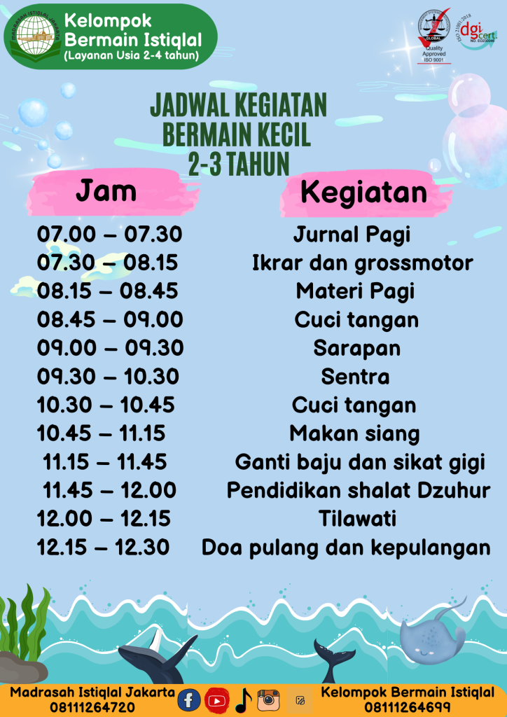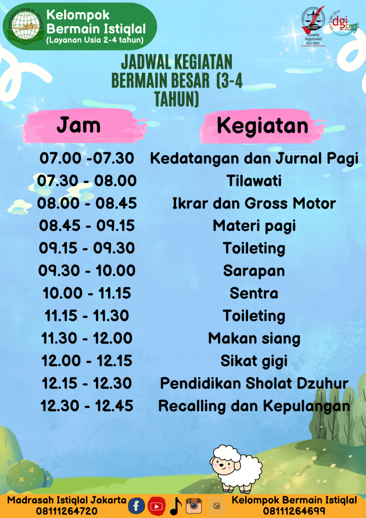 Kegiatan daycare meliputi rutinitas harian yang terstruktur: bersih-bersih, tidur siang, mandi sore, snack time, hingga pembelajaran sore yang dikemas secara menyenangkan. Didukung oleh tenaga pendidik profesional, Daycare KB Istiqlal tidak hanya menghadirkan layanan pengasuhan dan perlindungan, tetapi juga memberikan stimulasi perkembangan yang sesuai dengan usia anak.